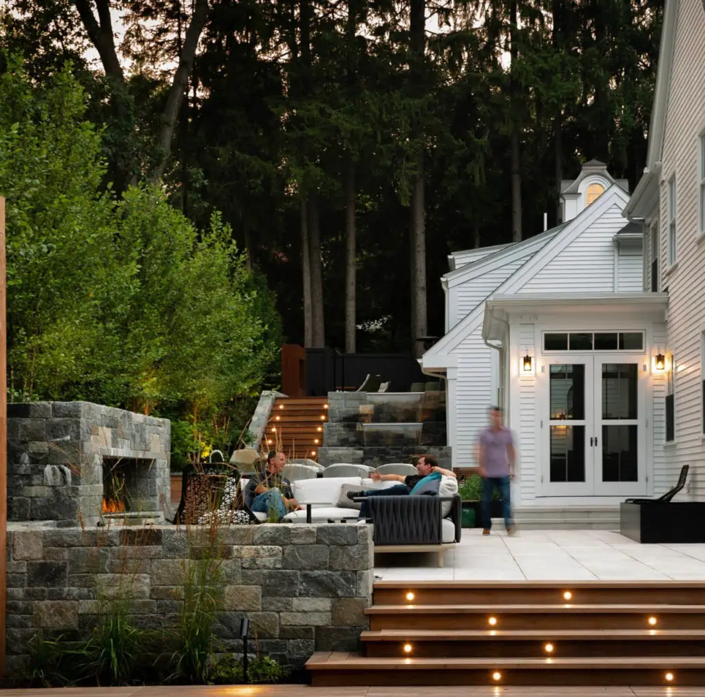 Woodland-inspired outdoor living with layered elevations.