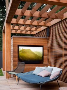A modern pergola structure frames the lounge area, complemented by a full-length outdoor kitchen designed for seamless hosting. Wood decking softens the stone palette, creating contrast and warmth within the architectural composition.
