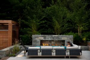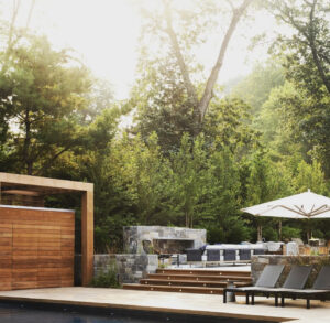 A layered outdoor living retreat defined by stone, wood, fire, and water — composed for elevated urban living.
