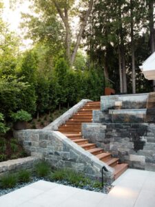 Yes. In fact, elevation changes often create opportunity for layered design. Retaining walls and stepped transitions can transform challenging topography into structured outdoor living environments.