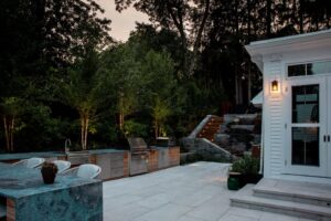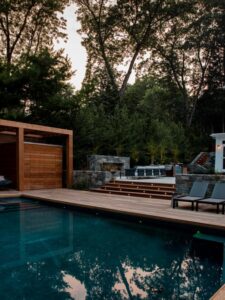 For a design-driven project incorporating a custom pool, terraced stone retaining, architectural water feature, pergola structure, and outdoor kitchen, investment typically ranges from $175,000 to $300,000+ depending on material selections and structural complexity.