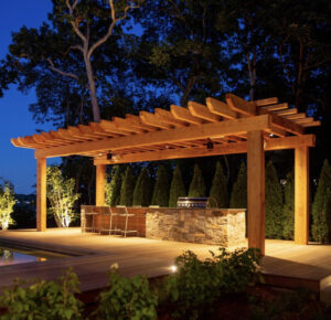 A modern pergola lounge anchors the primary gathering space, while a full-length outdoor kitchen and fireplace seating wall create an atmosphere designed for evening use. Thoughtful elevation changes and integrated stair lighting guide movement throughout the space, reinforcing both functionality and visual depth.