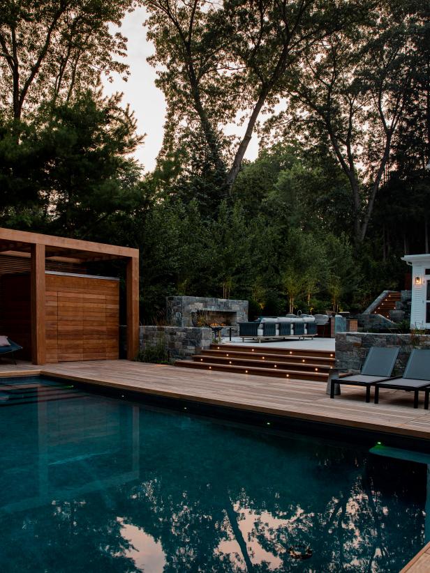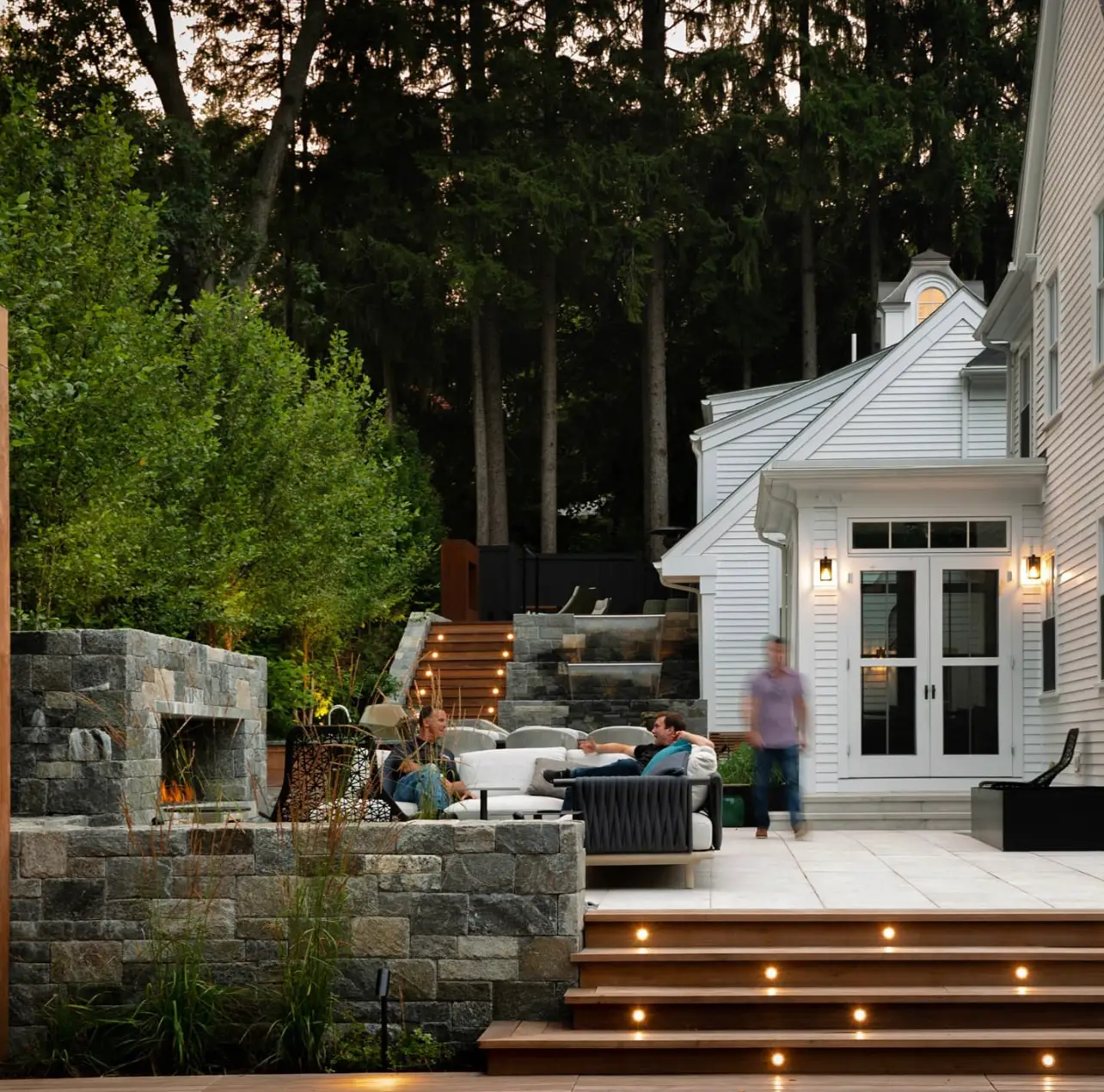 A layered outdoor living retreat defined by stone, wood, fire, and water — composed for elevated urban living.
